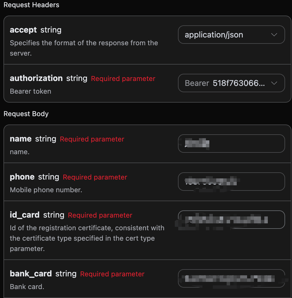 bank_card: Die zu verarbeitende Bankkartennummer, ist ein Pflichtparameter.id_card: Die Ausweisnummer, ist ein Pflichtparameter.name: Der Name des Benutzers, ist ein Pflichtparameter.phone: Die hinterlegte Handynummer.cert_type: Der Ausweistyp, muss mit dem Ausweis übereinstimmen.encryption: Optional, Parameter zur Verschlüsselung sensibler Felder (falls verschlüsselte Daten gesendet werden müssen).