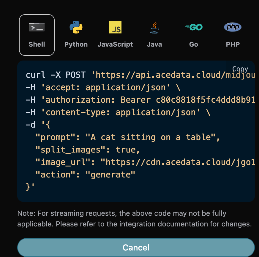 De plus, si vous souhaitez générer le code d’intégration correspondant, vous pouvez le copier directement, par exemple, le code CURL est le suivant :