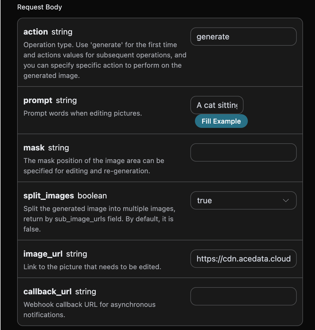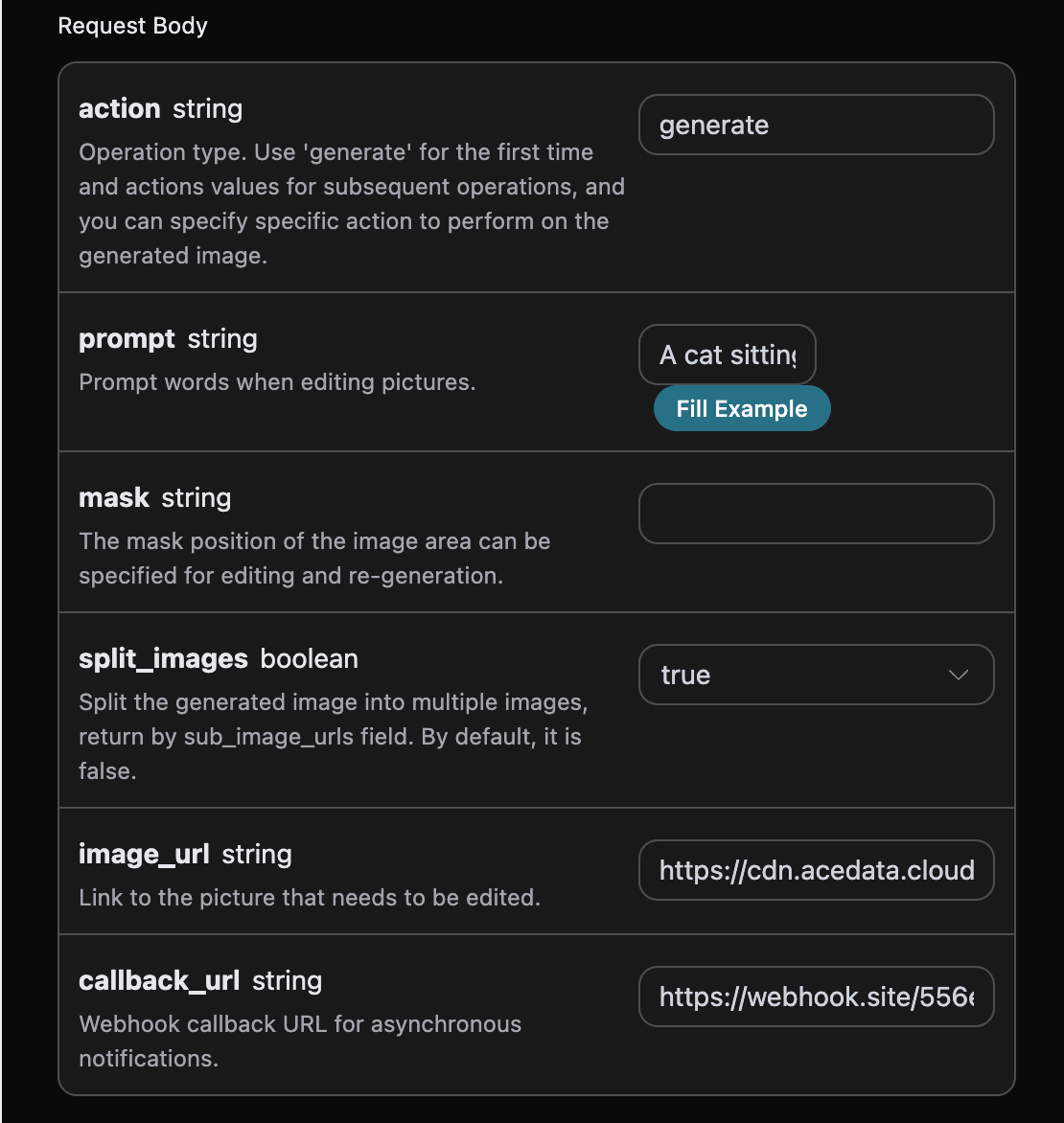 mask: peut spécifier la position du masque de la zone d’image à éditer et à régénérer.split_images: divise l’image générée en plusieurs images, renvoyées via le champ sub_image_urls. Par défaut, c’est false.action: le comportement de la tâche de génération d’image, par défautgenerate.image_url: le lien de l’image à éditer.prompt: le mot-clé.mode: le mode de génération, optionsfast/relax/turbo.callback_url: l’URL pour recevoir les résultats.