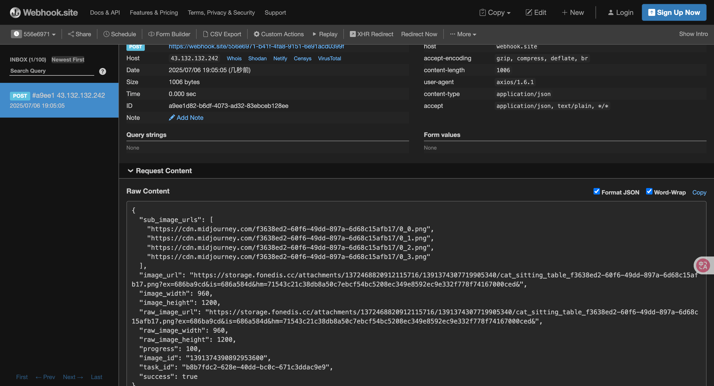 Étant donné que le temps de génération de l’API Midjourney Edits est relativement long, environ 1 à 2 minutes, si l’API ne répond pas pendant longtemps, la requête HTTP maintiendra la connexion, entraînant une consommation supplémentaire de ressources système. Ainsi, cette API propose également un support de rappel asynchrone. Le processus global est le suivant : lorsque le client initie une demande, il spécifie également un champcallback_url. Après que le client ait lancé la demande API, l’API renverra immédiatement un résultat contenant un champ task_id, représentant l’ID de la tâche actuelle. Lorsque la tâche est terminée, le résultat de la génération sera envoyé au callback_url spécifié par le client sous forme de POST JSON, incluant également le champ task_id, permettant ainsi de relier le résultat de la tâche par ID.