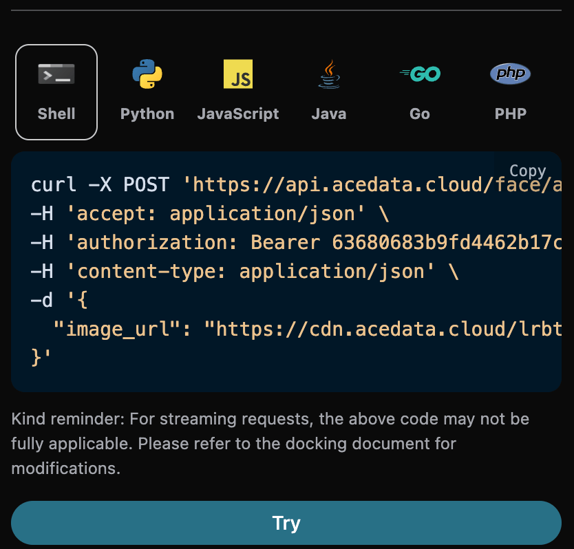 另外如果想生成对应的对接代码,可以直接复制生成,例如 CURL 的代码如下: