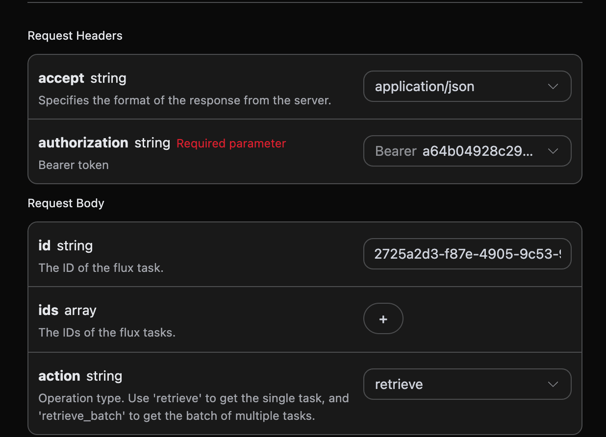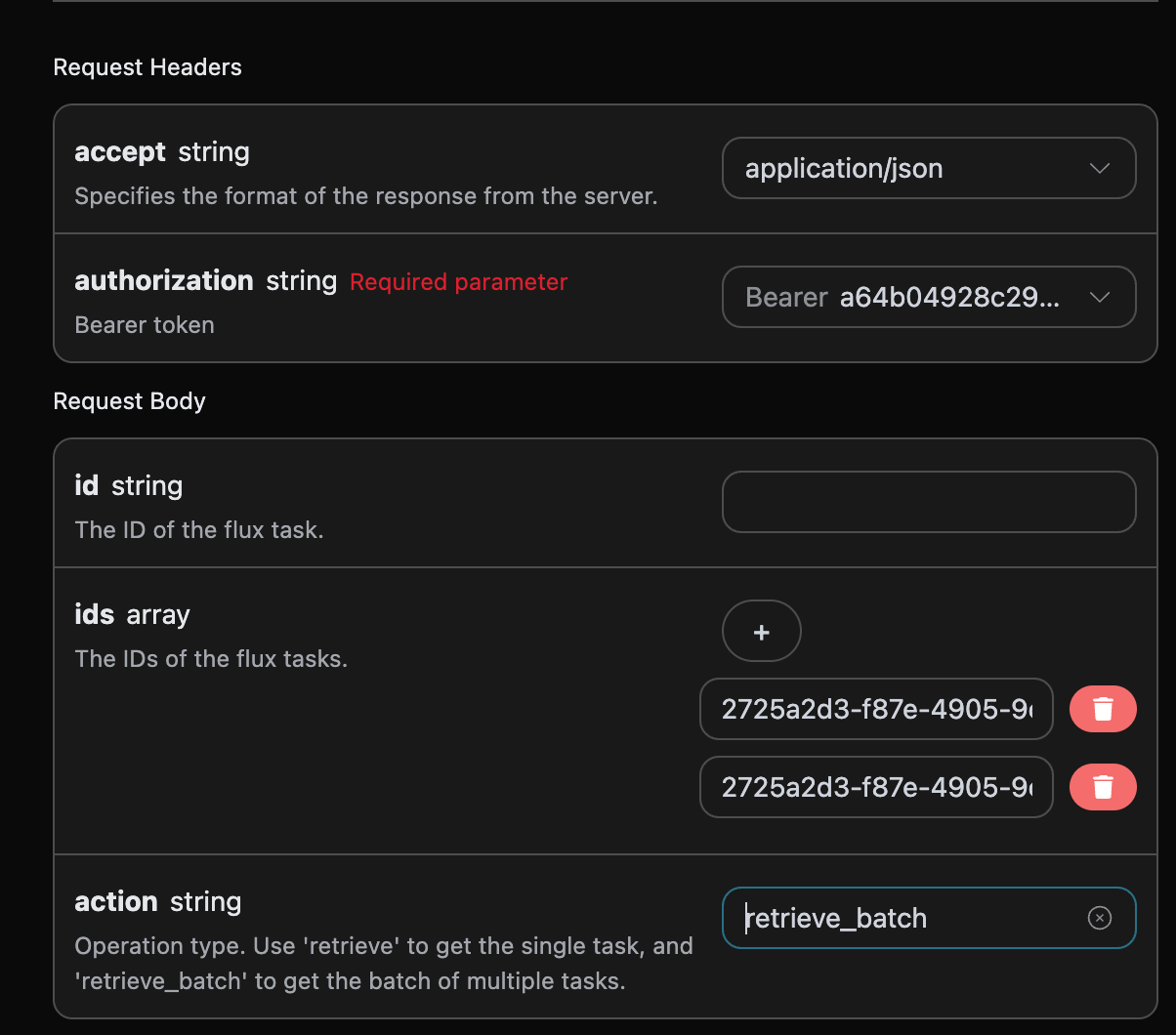 这是是针对多个任务ID来进行查询任务详情,与上面不同的是需要将action选中为retrieve_batch Request Body 包括: