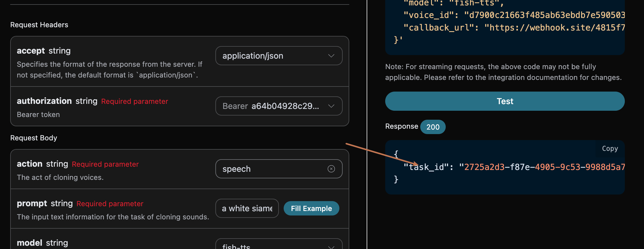 Fish Tasks API 可以用于查询 Fish Audios Generation API 的结果。关于怎样使用 Fish Audios Generation API,请参考文档 Fish Videos Generation API 我们以 Fish Audios Generation API 服务返回的任务ID一个为例,演示如何使用该 API。假设我们有一个任务ID:2725a2d3-f87e-4905-9c53-9988d5a7b2f5,接下来演示如何通过传入一个任务ID来。