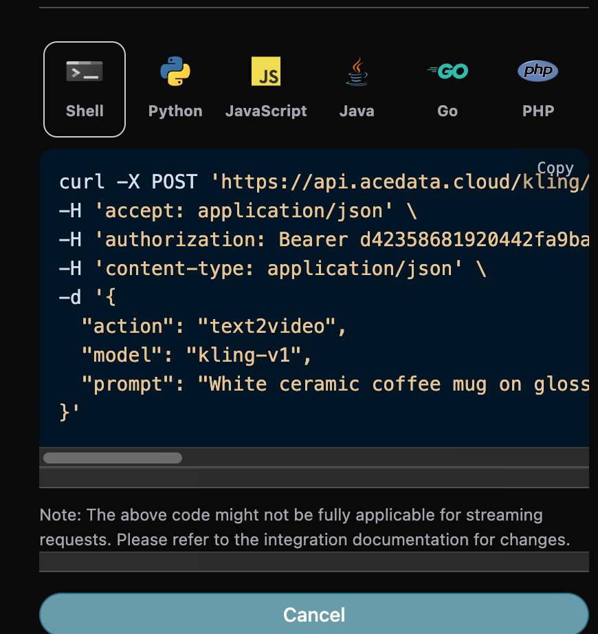 另外如果想生成对应的对接代码,可以直接复制生成,例如 CURL 的代码如下: