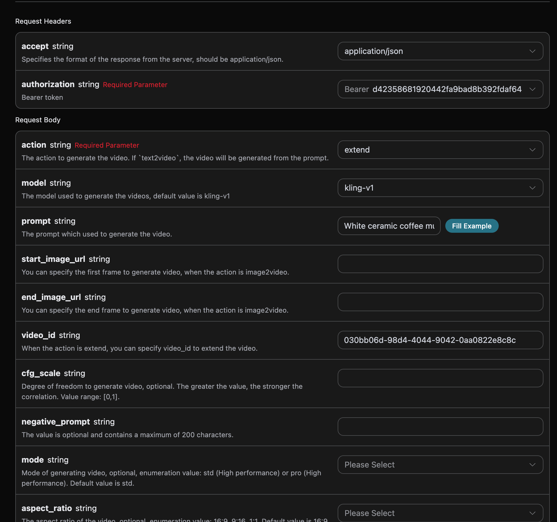 如果想对已经生成的Kling视频进行继续生成的话,可以将参数action 设置为 extend ,并且输入需要继续生成视频的 ID,视频 ID 的获取是根据基本使用来获取,如下图所示: