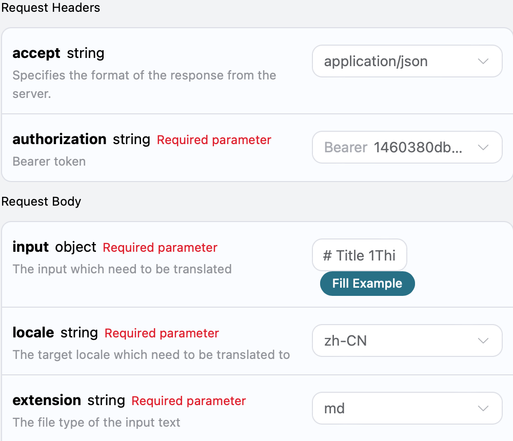 input:上传的所需翻译的文本。locale:自定义翻译的语言。extension:自定义翻译结果的展示形式。model:翻译采用的大模型,默认是 gpt-3.5。