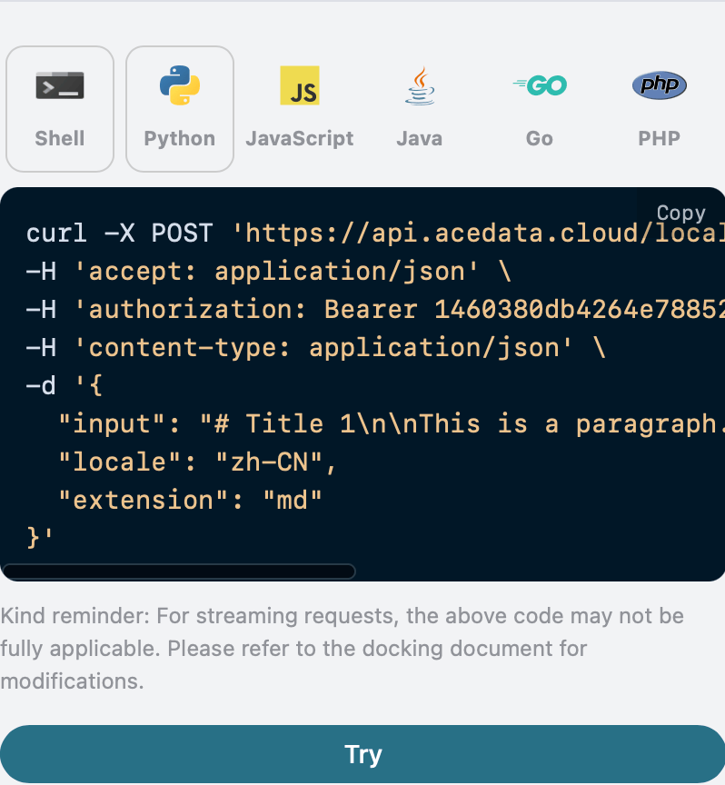 本文档将详细介绍 Translate API 的对接说明,帮助您轻松集成并充分利用该 API 的强大功能。通过 Translate API ,您可以轻松实现将输入的文本翻译为特定语言,并且支持特定的方式来输出翻译结果。
