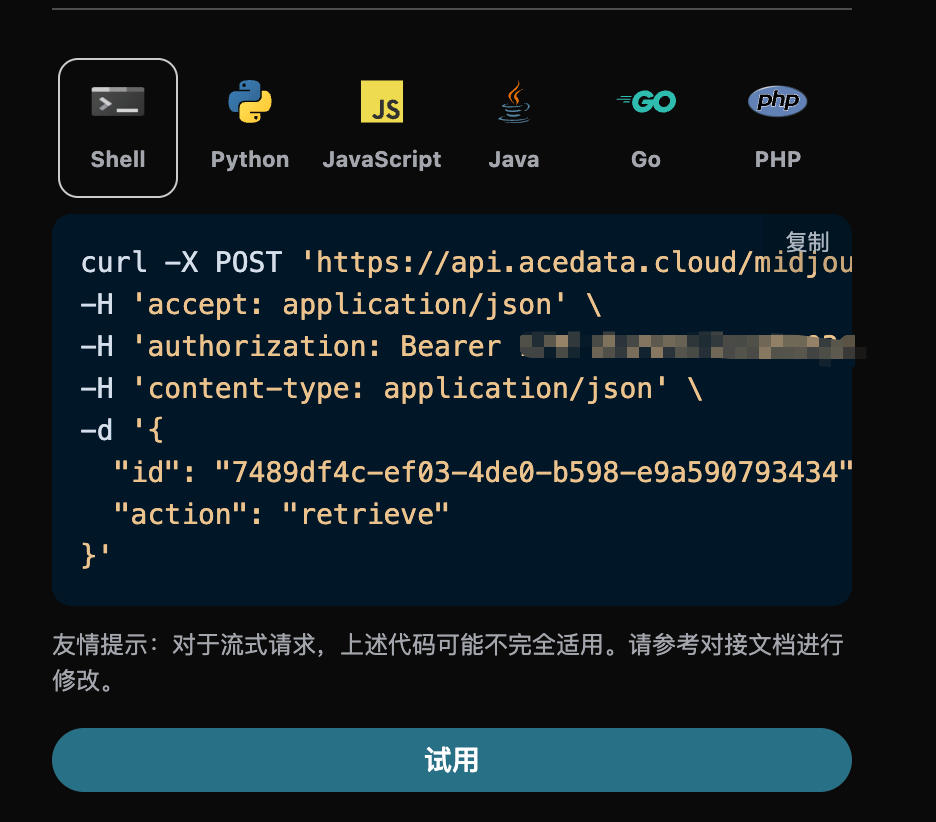 要使用 Midjourney Tasks API,需要先到 申请页面 Midjourney Imagine API 申请相应的服务,然后复制Imagine API的任务ID,如图所示: