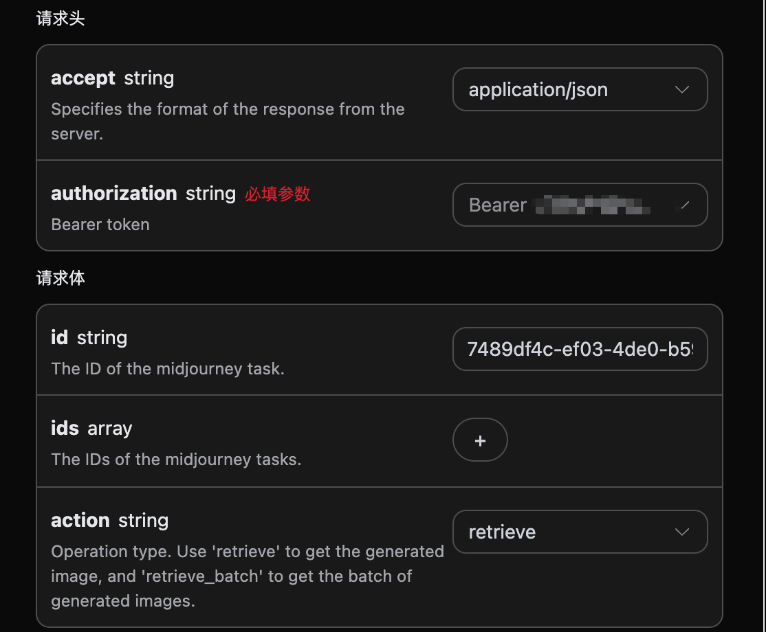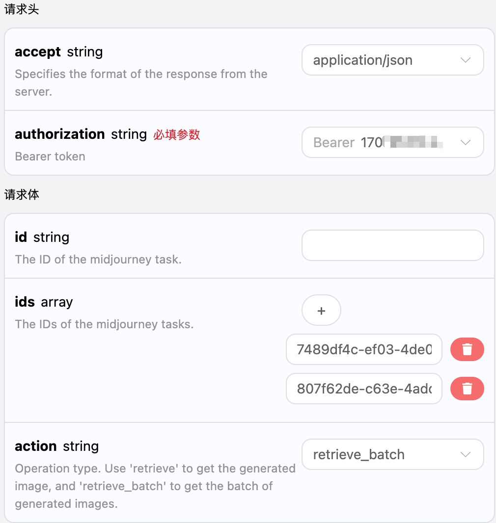 这是是针对多个任务ID来进行查询图片任务详情,与上面不同的是需要将action选中为retrieve_batch Request Body 包括: