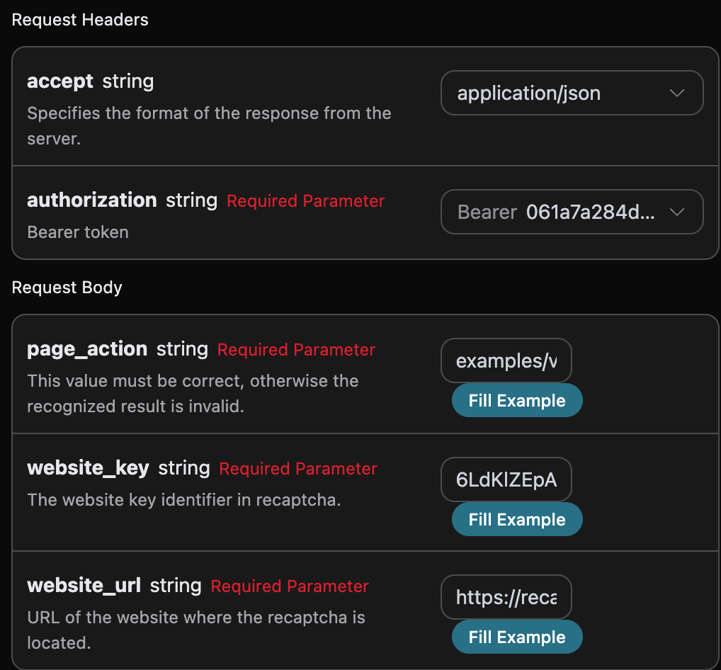 page_action:需要在验证码的网站代码获取。website_url:需要处理验证码的网站URL。website_key:在Recaptcha3中的网站密钥标识符。