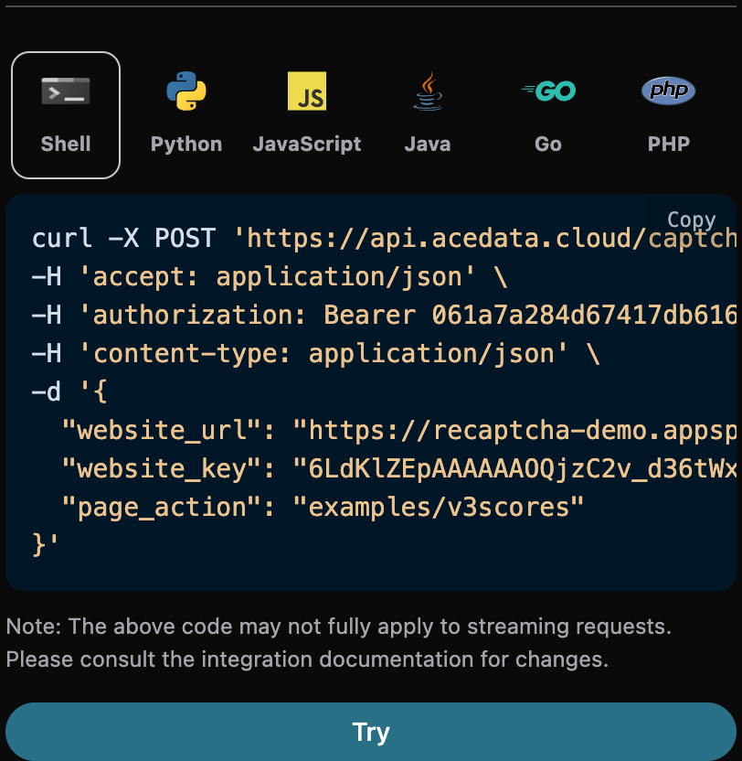 另外如果想生成对应的对接代码,可以直接复制生成,例如 CURL 的代码如下: