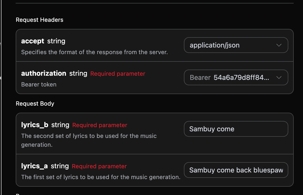 有了歌词之后,我们便可以使用 Suno Audios Generation API 来进行自定义歌曲生成了。