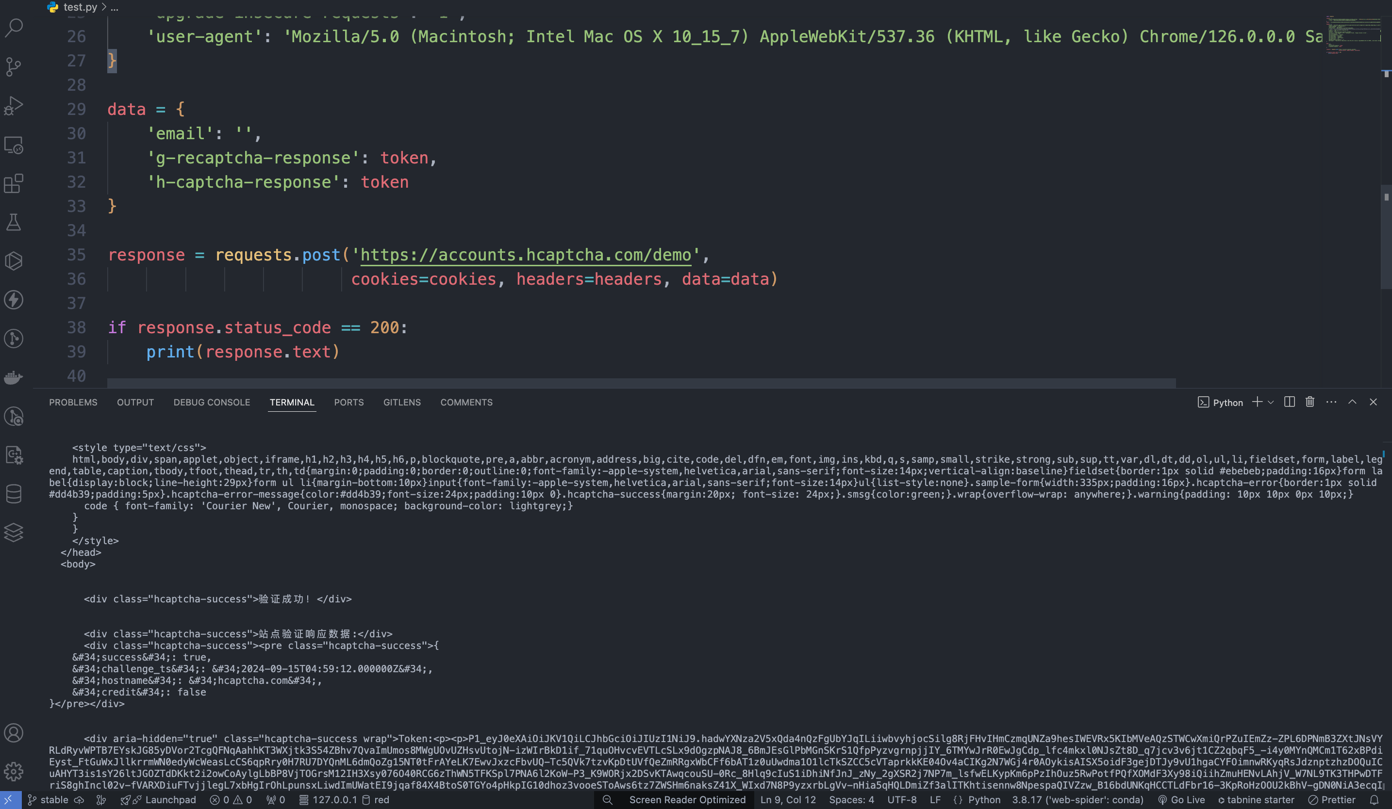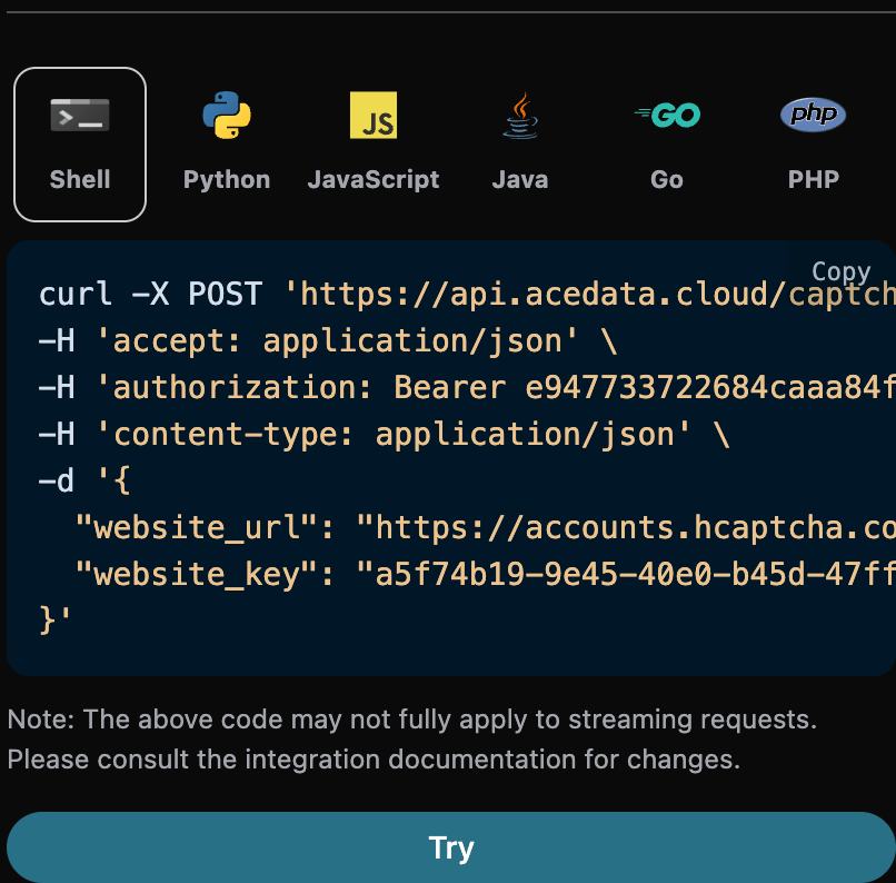 https://accounts.hcaptcha.com/demo,我们仅需要提交参数 g-recaptcha-response、h-captcha-response 和 email,然后我们只需要将处理后的token传入下面的data中即可,调用token验证所对应CURL代码如下: