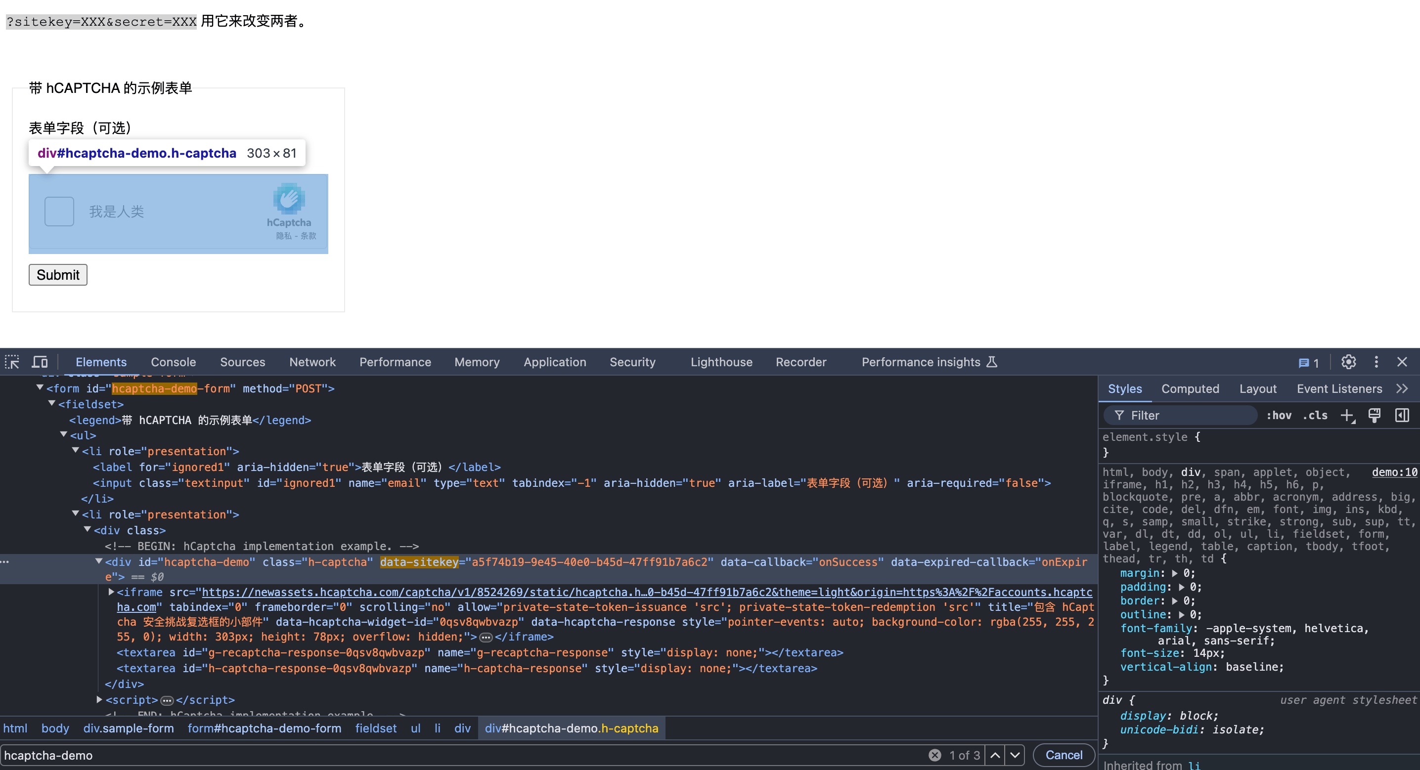 Innanzitutto, è importante comprendere il modo di utilizzo di base, che consiste nell’inserire l’URL del sito web che deve elaborare il captcha hCaptcha per ottenere il risultato elaborato. È necessario semplicemente trasmettere un campowebsite_url. Il nostro sito di esempio è: https://accounts.hcaptcha.com/demo, dobbiamo ottenere il website_key dalla pagina website_url. Prima di tutto, aprire questa pagina, premere F12 per accedere alla console e infine cercare globalmente hcaptcha-demo nella pagina Element. Possiamo ottenere il seguente risultato: