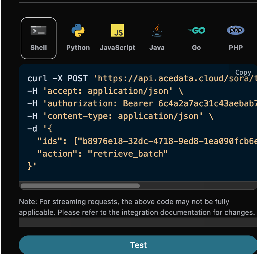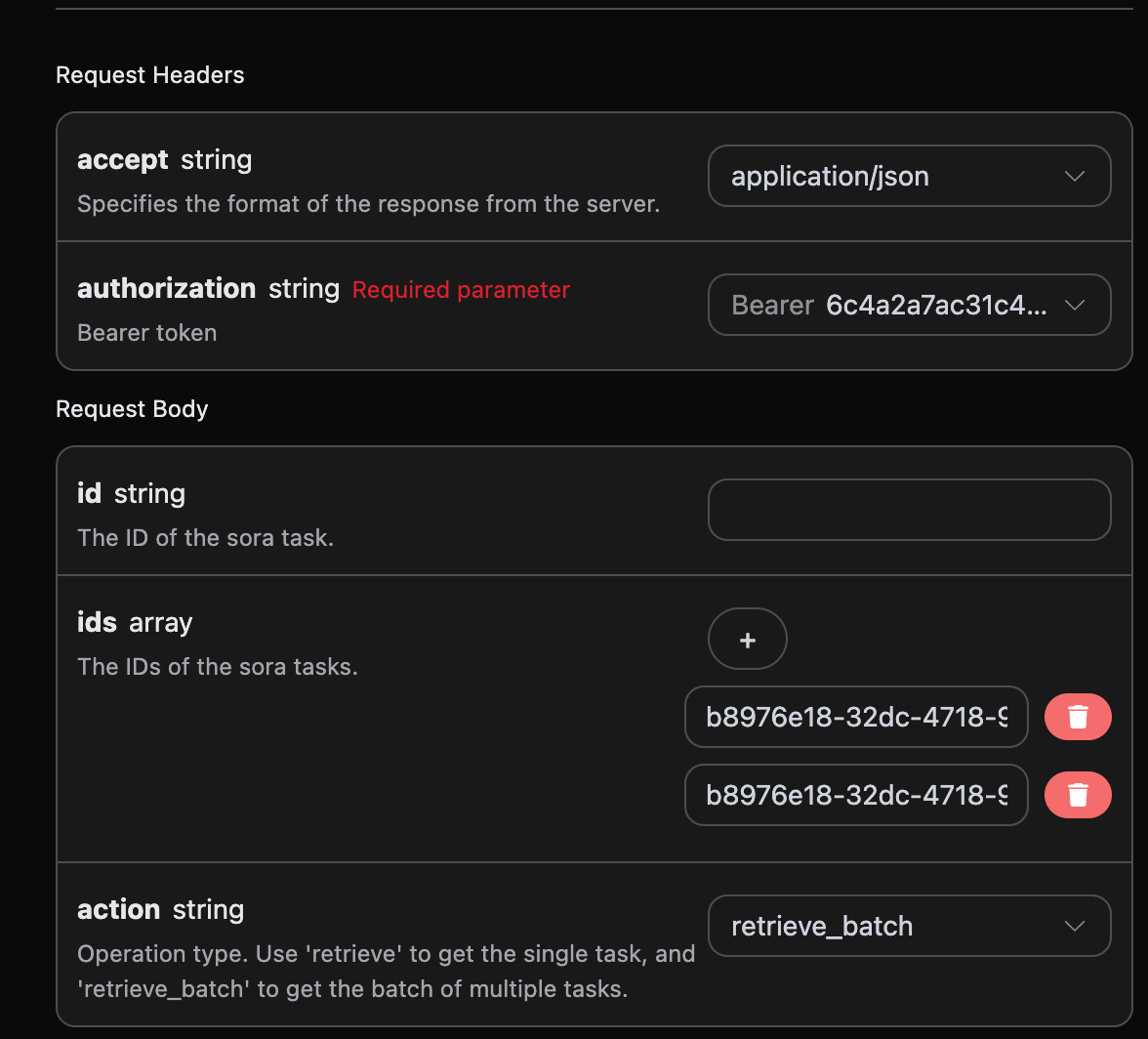 Sora Tasks API의 주요 기능은 Sora Videos Generation API에서 생성된 작업 ID를 입력하여 해당 작업의 실행 상태를 조회하는 것입니다. 본 문서는 Sora Tasks API의 연동 설명을 자세히 소개하여, 여러분이 쉽게 통합하고 이 API의 강력한 기능을 충분히 활용할 수 있도록 돕습니다. Sora Tasks API를 통해 Sora Videos Generation API의 작업 실행 상태를 쉽게 조회할 수 있습니다.