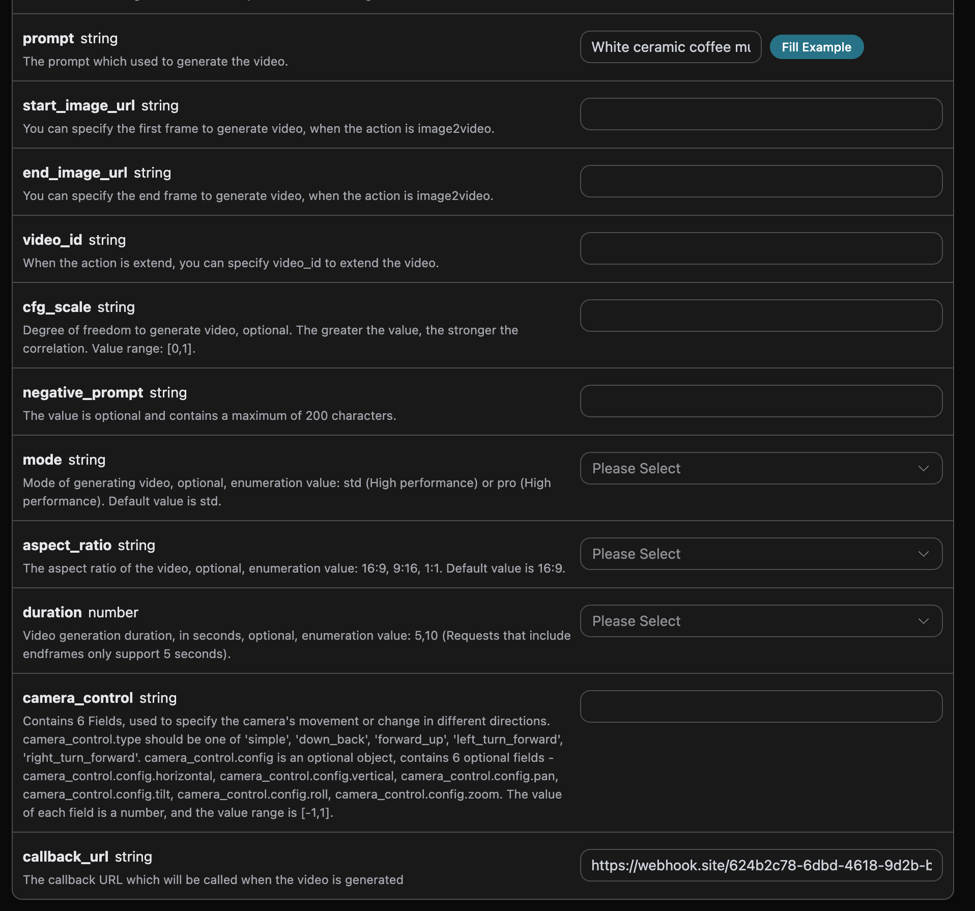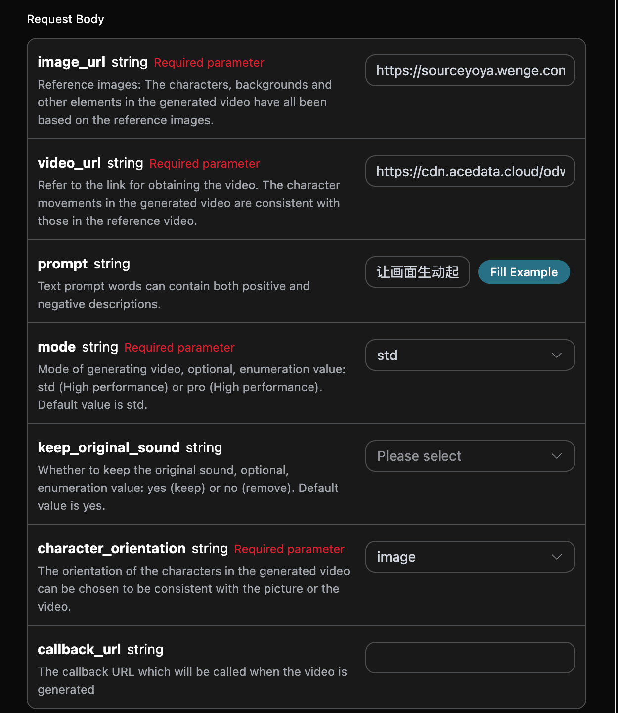 image_url: obraz referencyjny, postacie, tło i inne elementy w generowanym wideo są oparte na tym obrazie.video_url: link do pobrania referencyjnego wideo. Ruchy postaci w generowanym wideo będą zgodne z referencyjnym wideo.mode: tryb generowania wideo, głównie standardowy trybstdi tryb superszybkipro.keep_original_sound: możliwość wyboru, czy zachować oryginalny dźwięk wideo, wartości enum: yes, no.character_orientation: orientacja postaci w generowanym wideo, można wybrać zgodnie z obrazem lub wideo, wartości enum: image, video.prompt: słowo kluczowe.callback_url: URL, na który mają być zwracane wyniki.