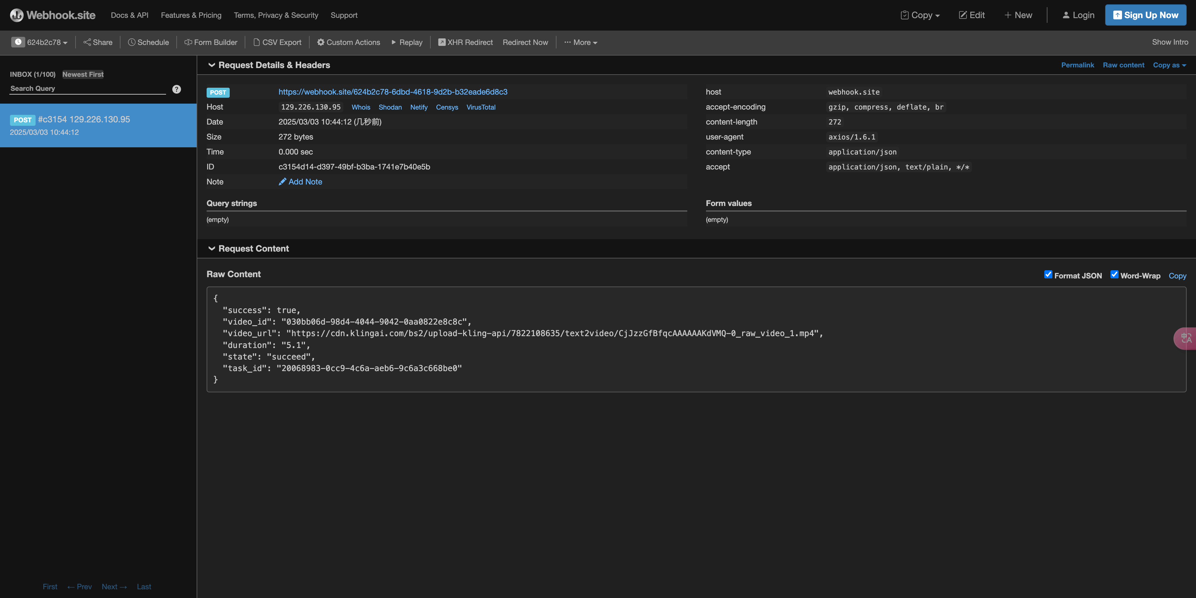 https://webhook.site/624b2c78-6dbd-4618-9d2b-b32eade6d8c3 zaobserwować wynik generowania wideo, jak na obrazku: