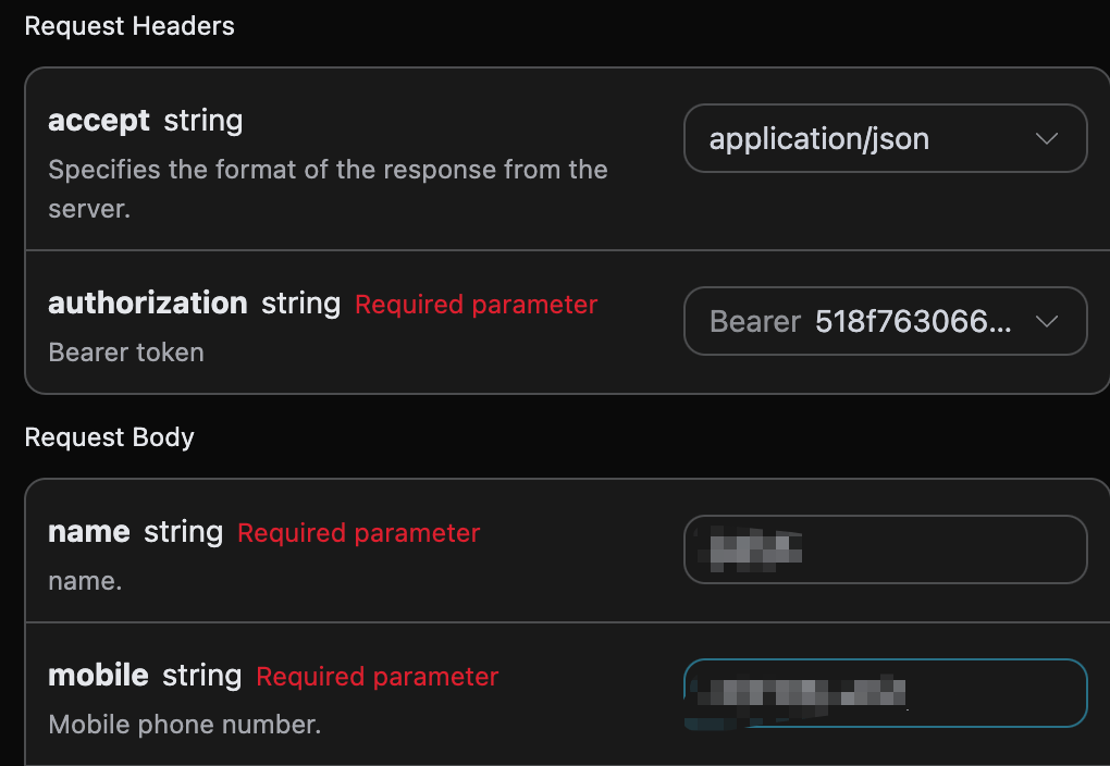 name: det namn som ska bearbetas, är ett obligatoriskt parameter.mobile: det mobilnummer som ska bearbetas, är ett obligatoriskt parameter.encryption: valfritt, känsliga fält krypteringsparameter (om krypterad text behöver skickas).